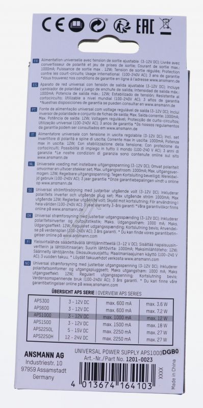 APS 1000 1201-0023 STECKERNETZTEIL UNIVERSAL 3-12V DC, INKL. 7 VERSCH. STECKERTYPEN